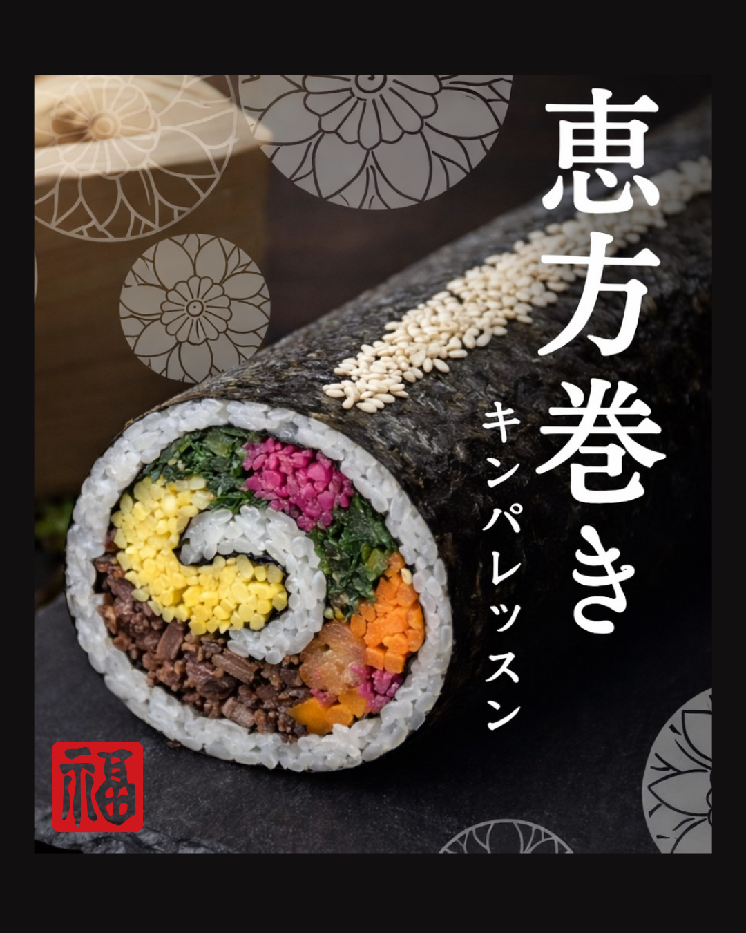 恵方巻キンパレッスン。 具材は ➀プルコギ ②人参ナムル ③ウオンジョリム(ごぼう煮込み) ④韓国たくあん ⑤紫キャベツの酢和え ⑥玉子 ⑦ホウレン草ナムル 参加費 6,600円 キンパ追加 1,080円/1本毎 ⚠️予約時の連絡事項に追加本数をお伝え下さい。